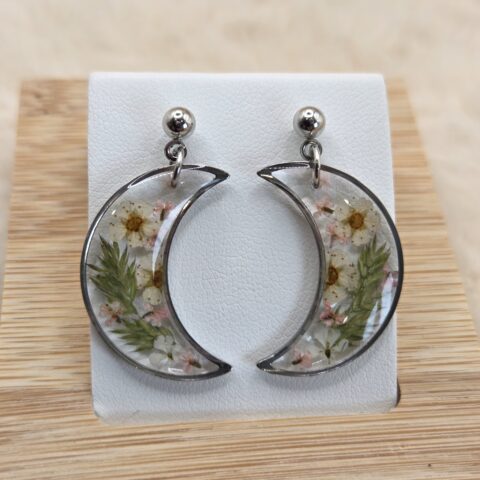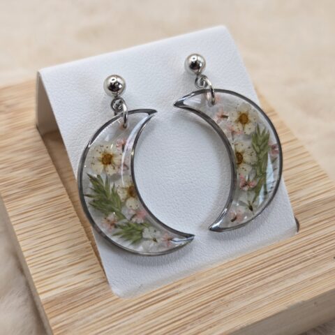 🌙✨ Boucles d’oreilles lune – Fleurs séchées & acier inoxydable