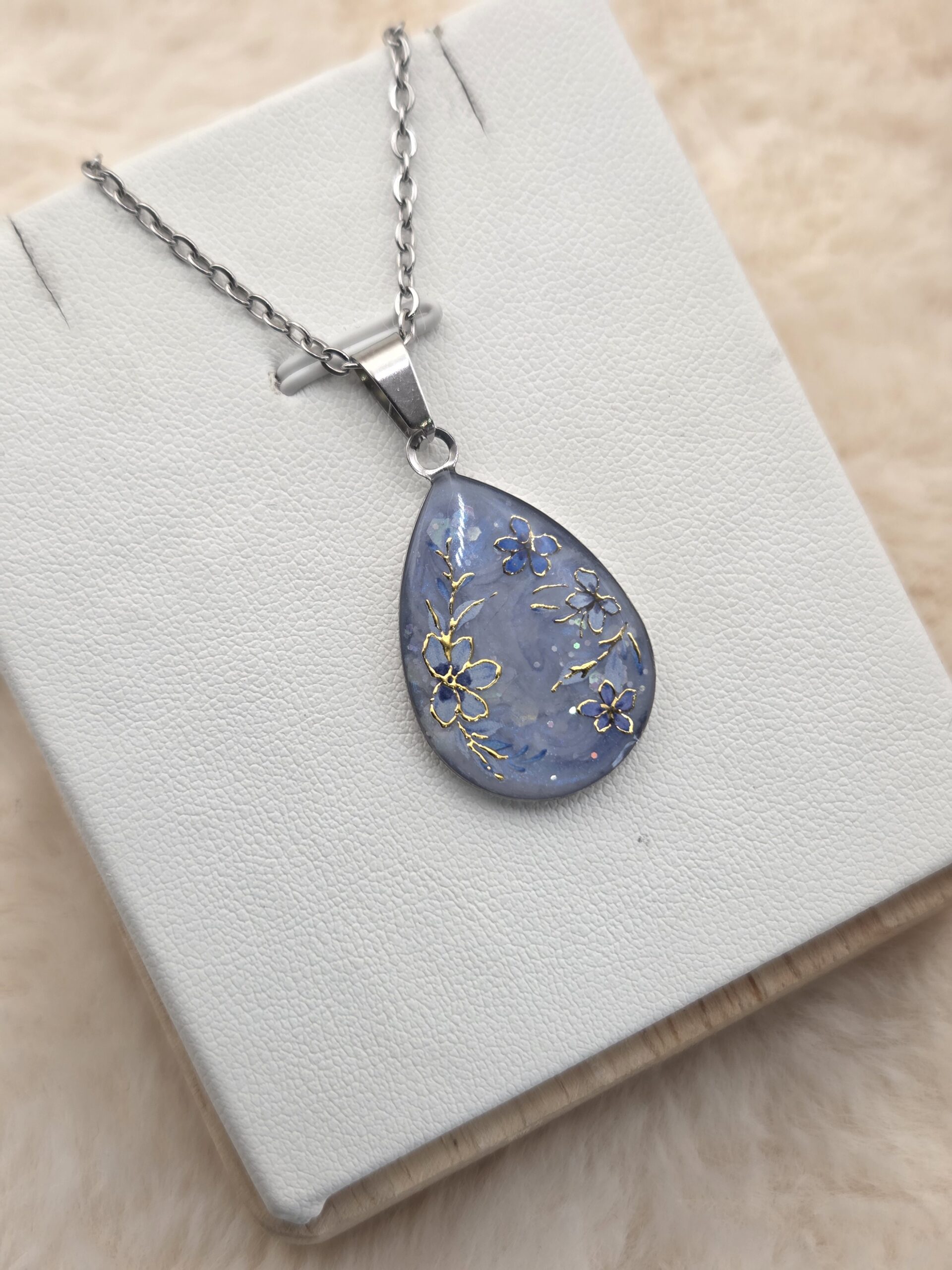 L’ensemble est sublimé par de motifs floraux bleus, finement dessinés, accompagnés d’un feuillage doré qui apporte une touche précieuse et élégante. La forme goutte accentue la finesse du bijou et met en valeur l’harmonie des couleurs et des détails.