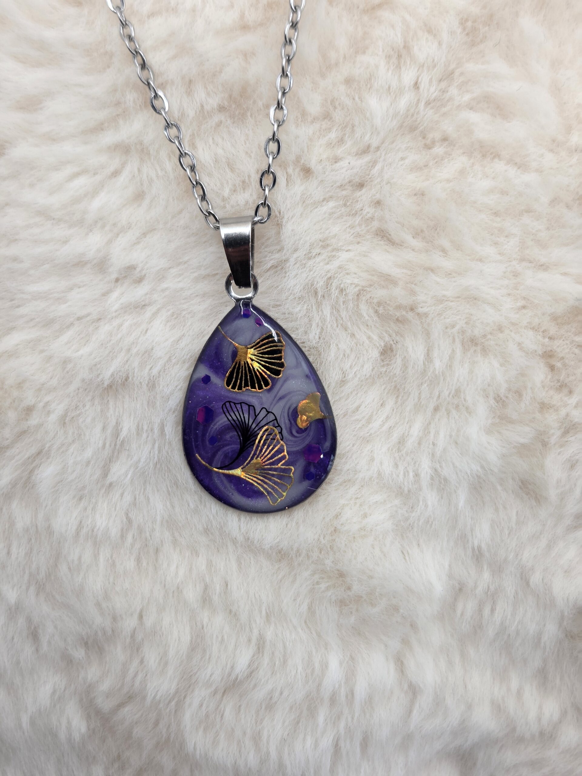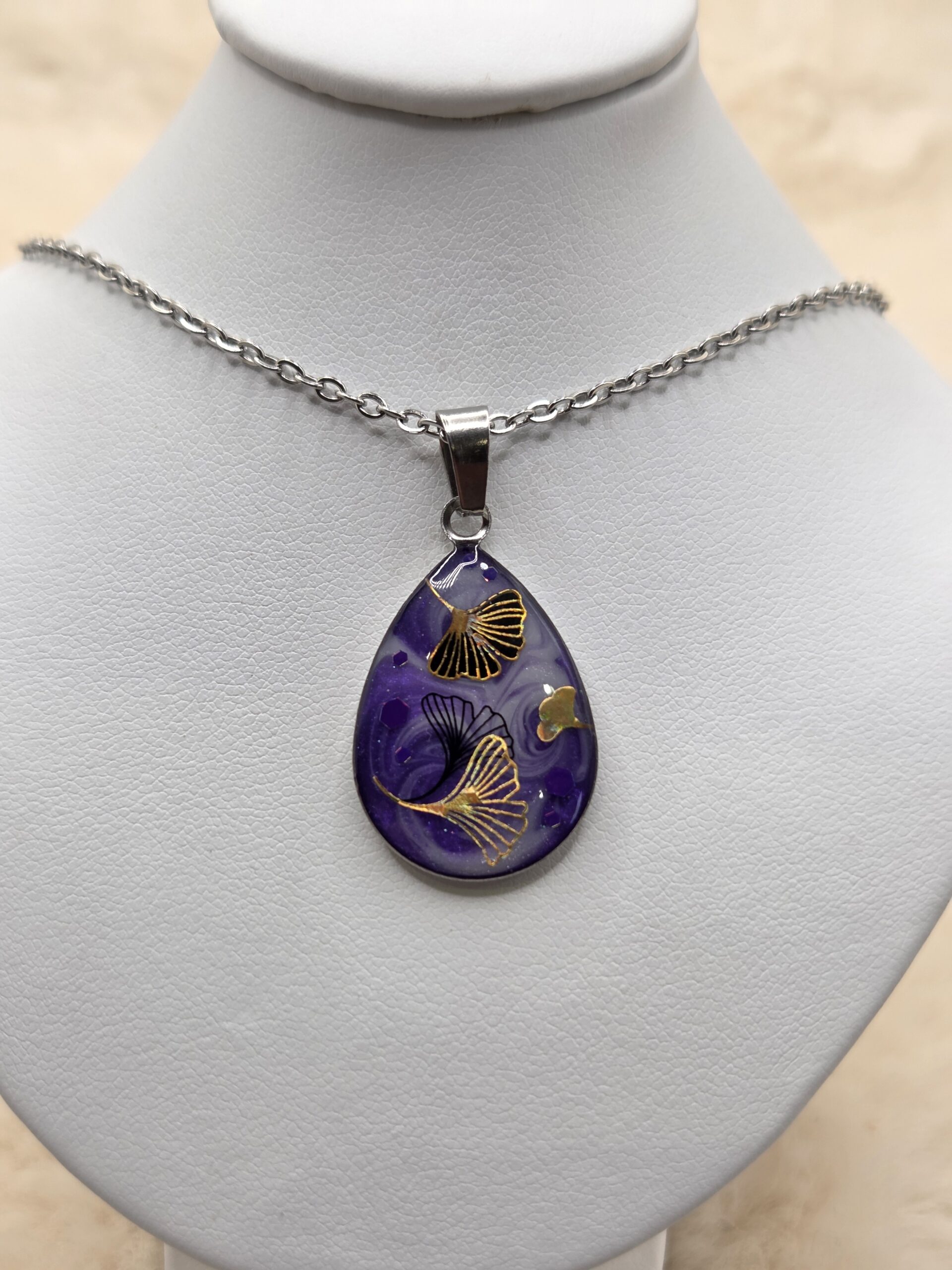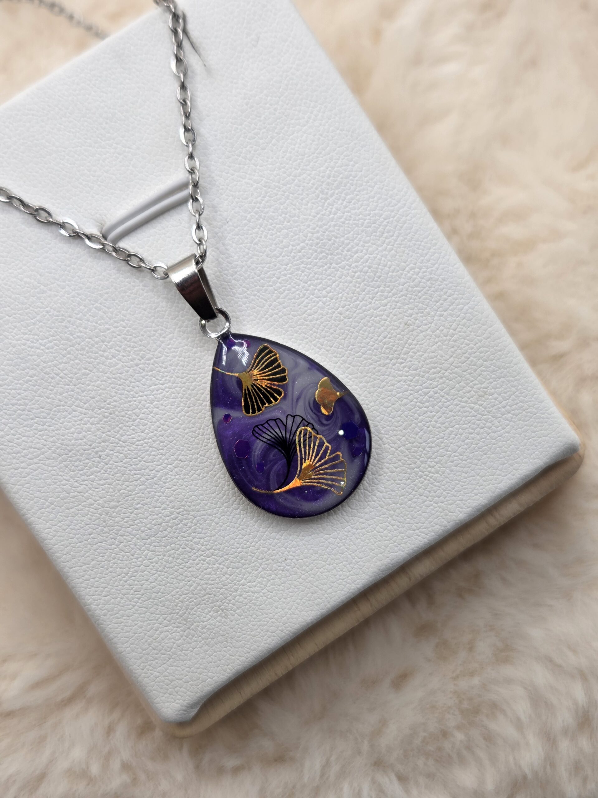 ✨ Pendentif Goutte Cabochon – Violet Marbré & Blanc • Feuilles de Ginkgo Dorées & Noires ✨