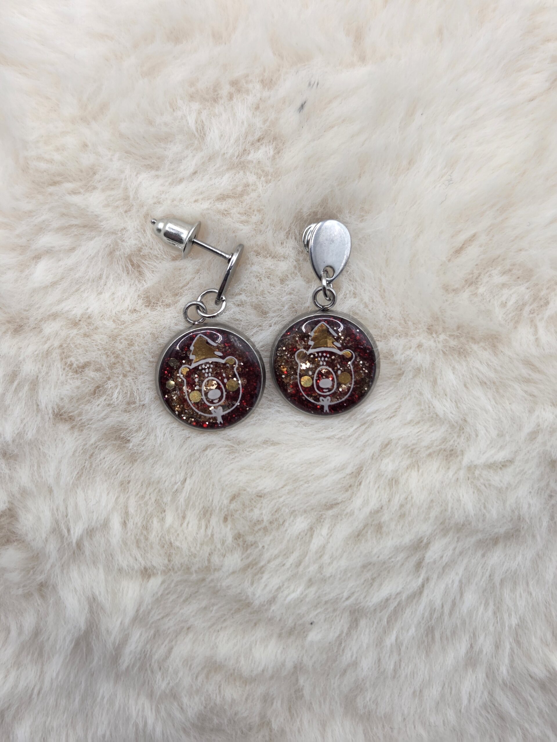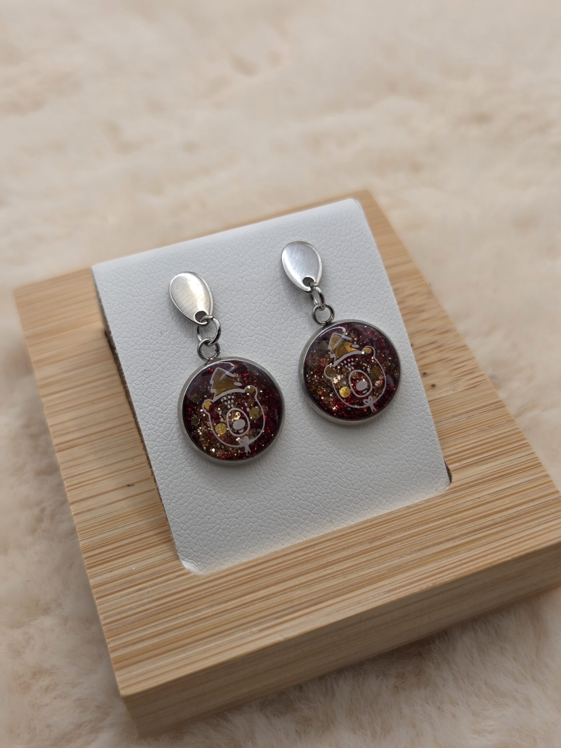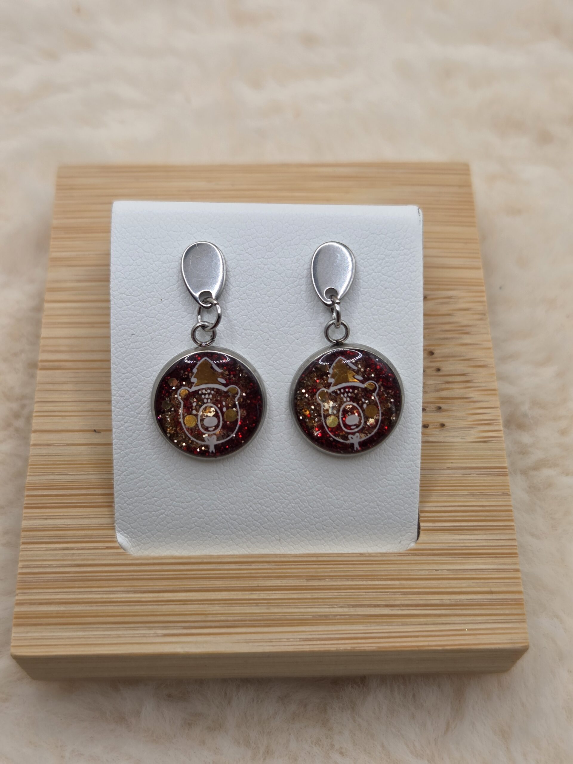 Chaque cabochon est surmonté d’un motif de petite tête d’ourson portant un bonnet de Noël, ajoutant une touche tendre, joyeuse et pleine de charme. Un bijou idéal pour accompagner vos tenues hivernales ou vos looks de fêtes 🎅❄️.