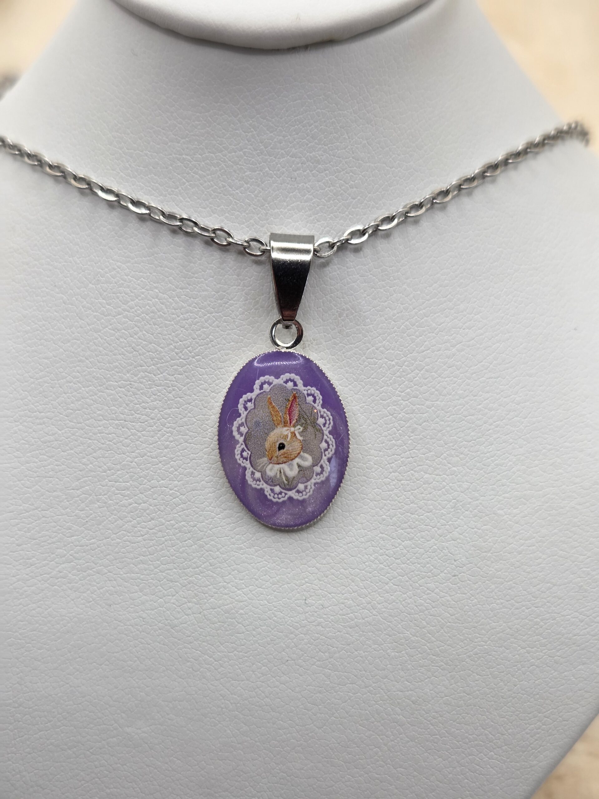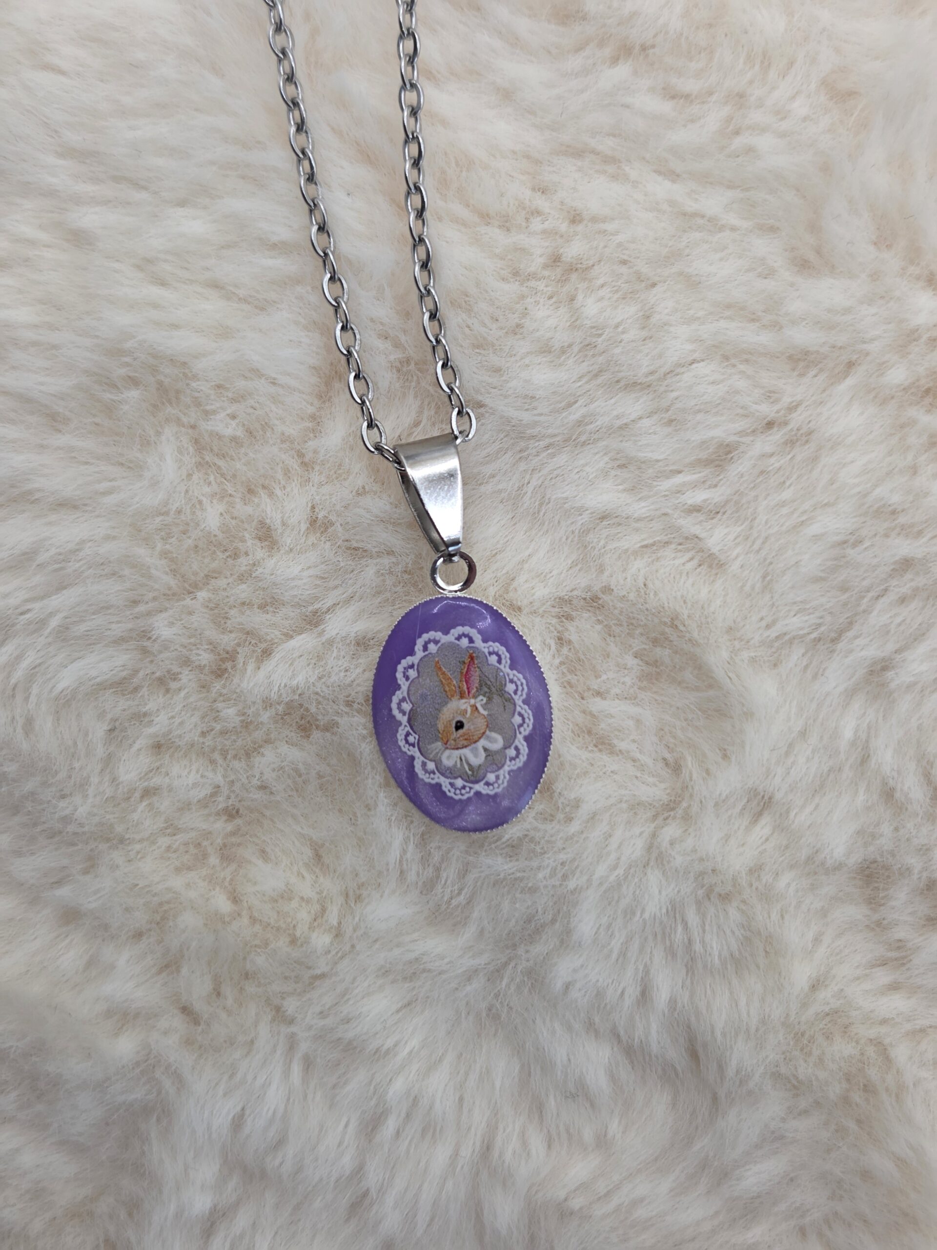 💜🐇 Pendentif Cabochon Ovale – Violet Nacré & Lapin au Col Claudine