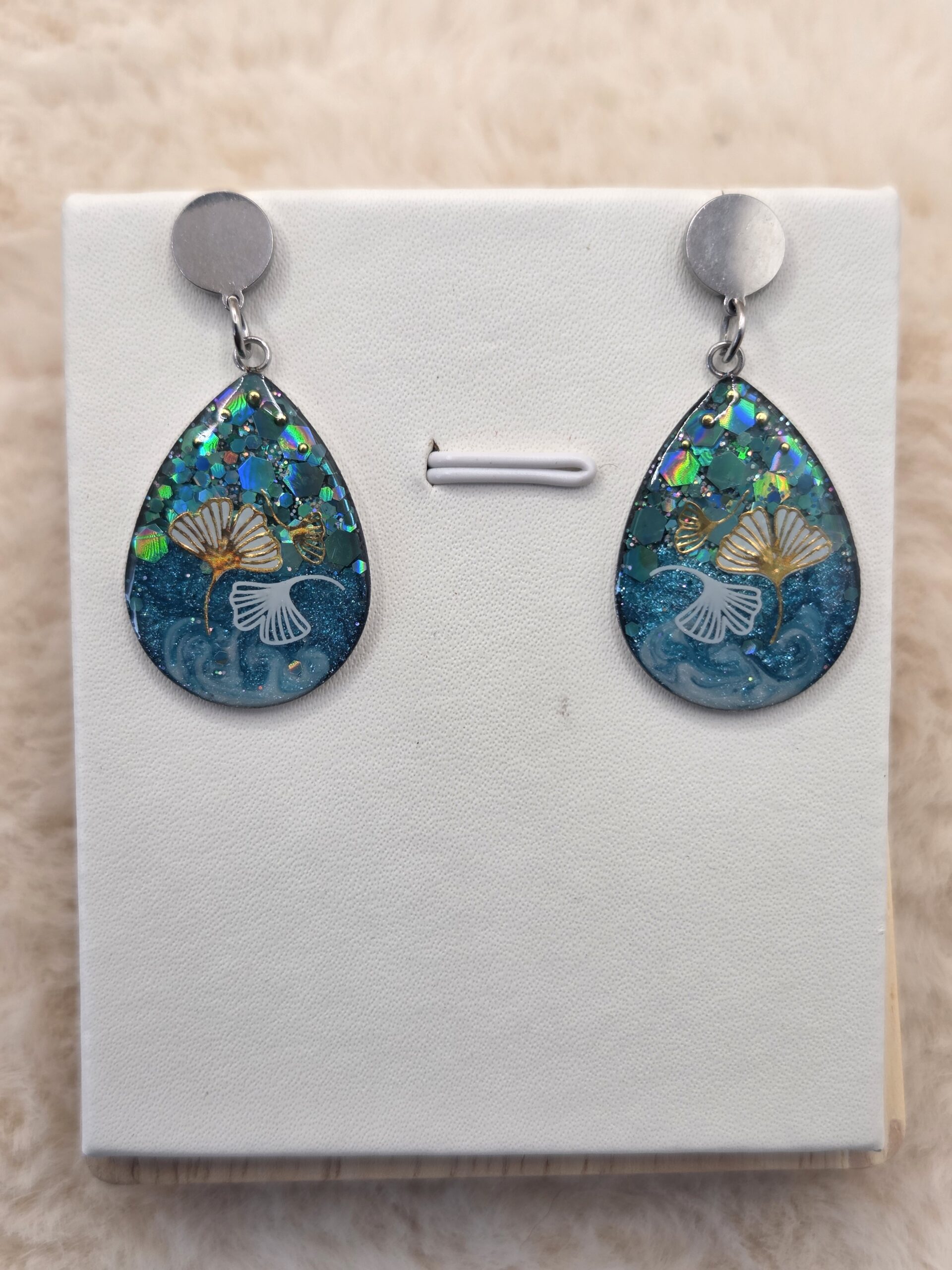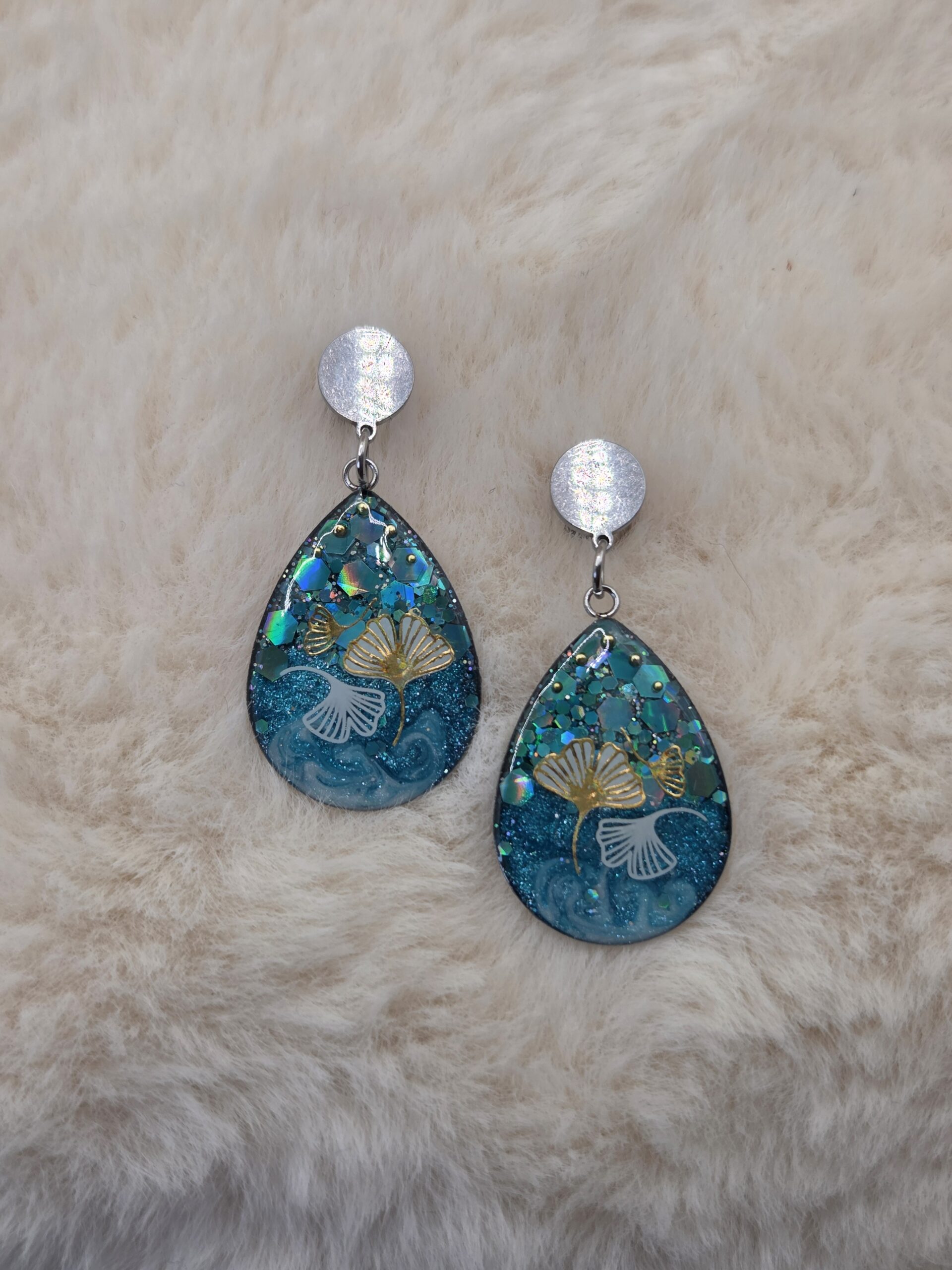 ✨ Boucles d’Oreilles Cabochon Ovales – Lagon Turquoise & Ginkgo Doré ✨