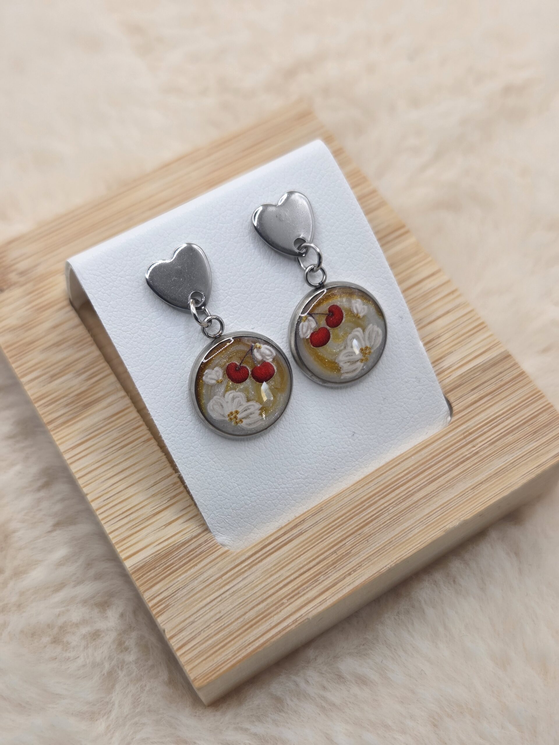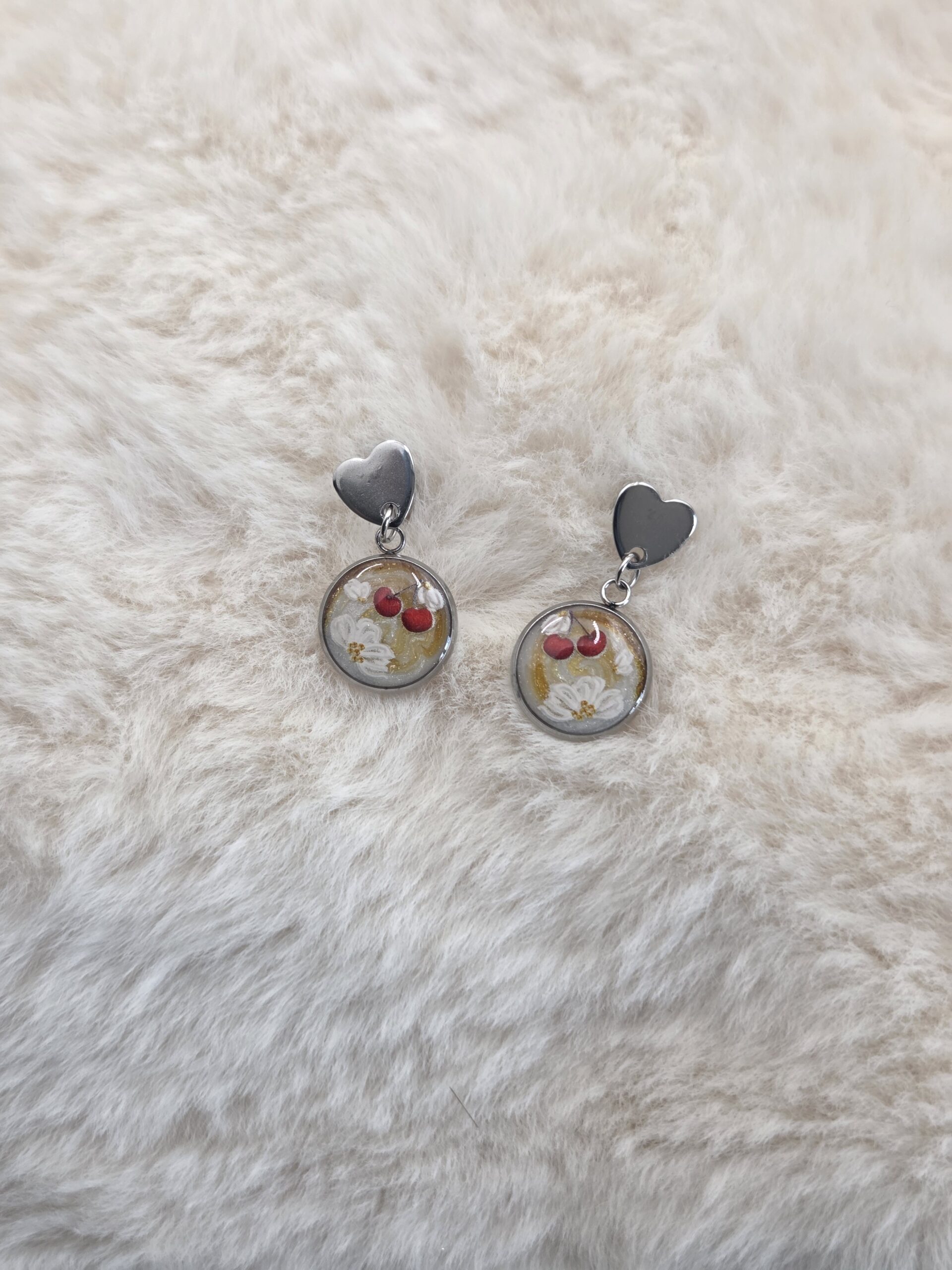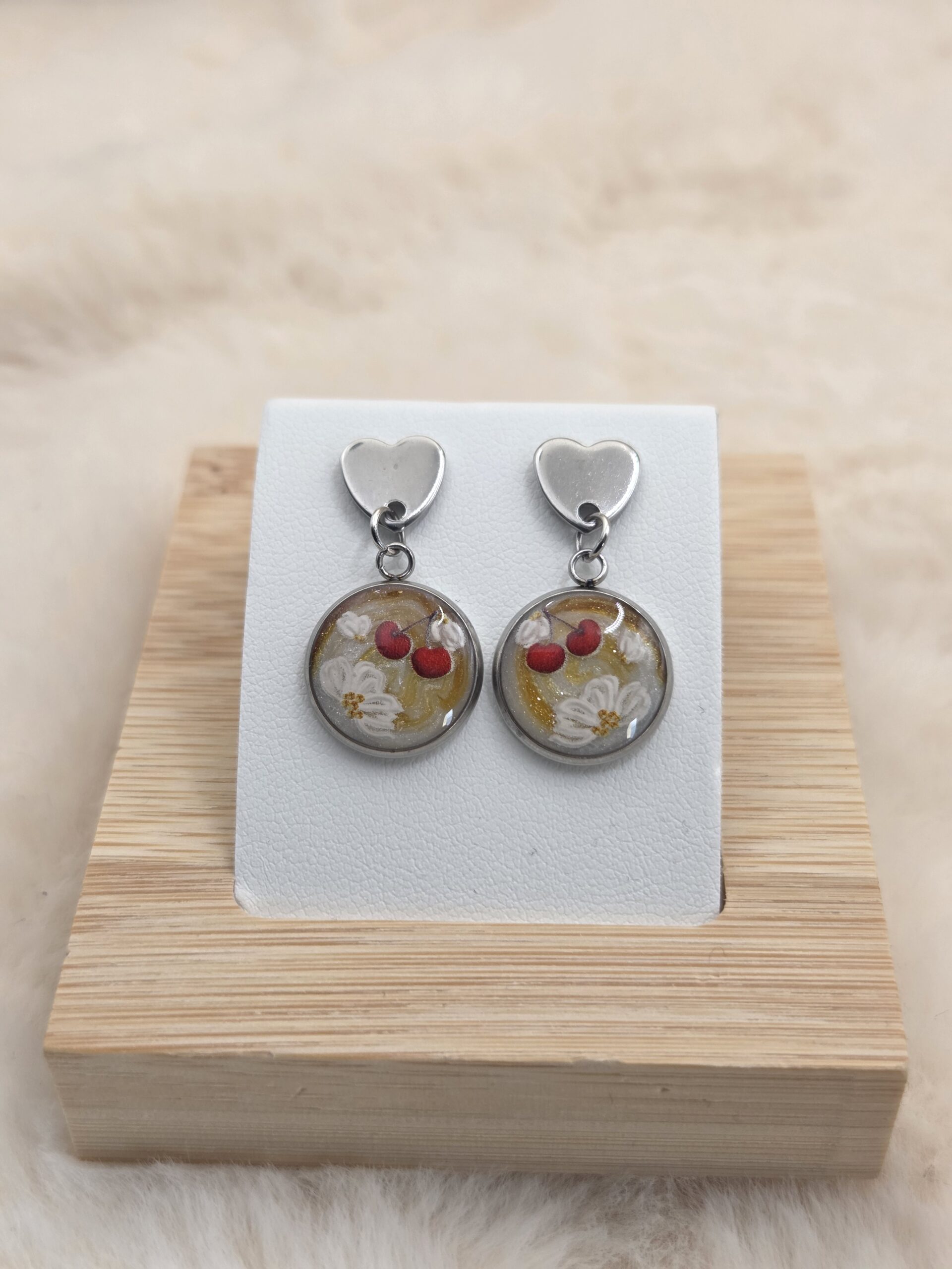 Ces boucles d’oreilles en acier inoxydable se composent d’attaches en forme de cœur ❤️, apportant une note romantique et moderne. Elles sont sublimées par un cabochon rond délicatement illustré, mêlant de jolies fleurs blanches 🌸 à de petites cerises rouges 🍒, le tout sur un fond lumineux rehaussé de touches dorées ✨.