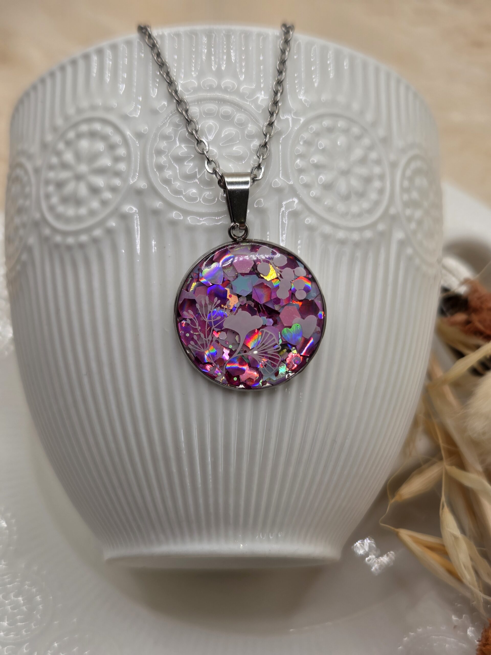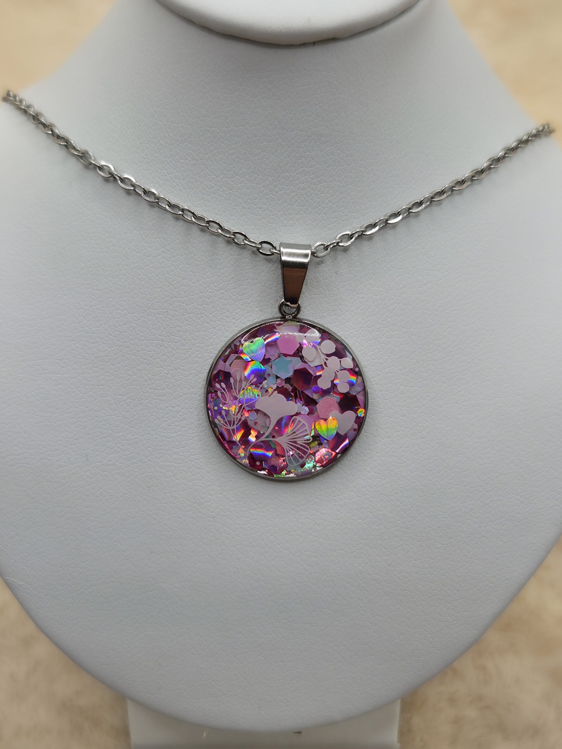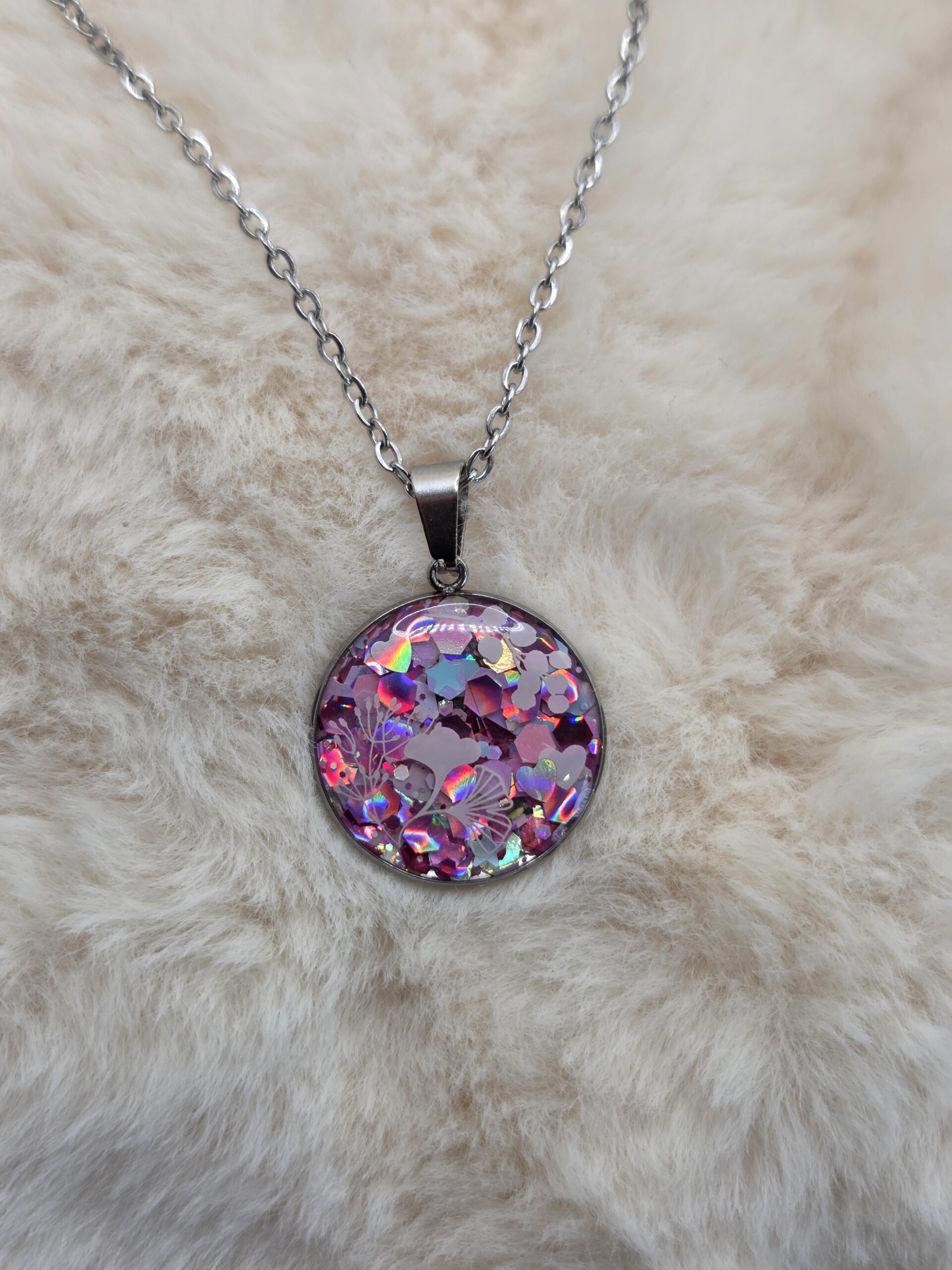 Apportez une touche féerique à vos tenues avec ce pendentif rond 20 mm 💖. Son fond scintillant aux tons roses brillants et iridescents capte la lumière pour un effet magique ✨. Surmonté de motifs délicats de branchages et de feuilles de ginkgo 🍃, il est parsemé de paillettes en forme de cœur 💕, pour une touche romantique et pétillante.