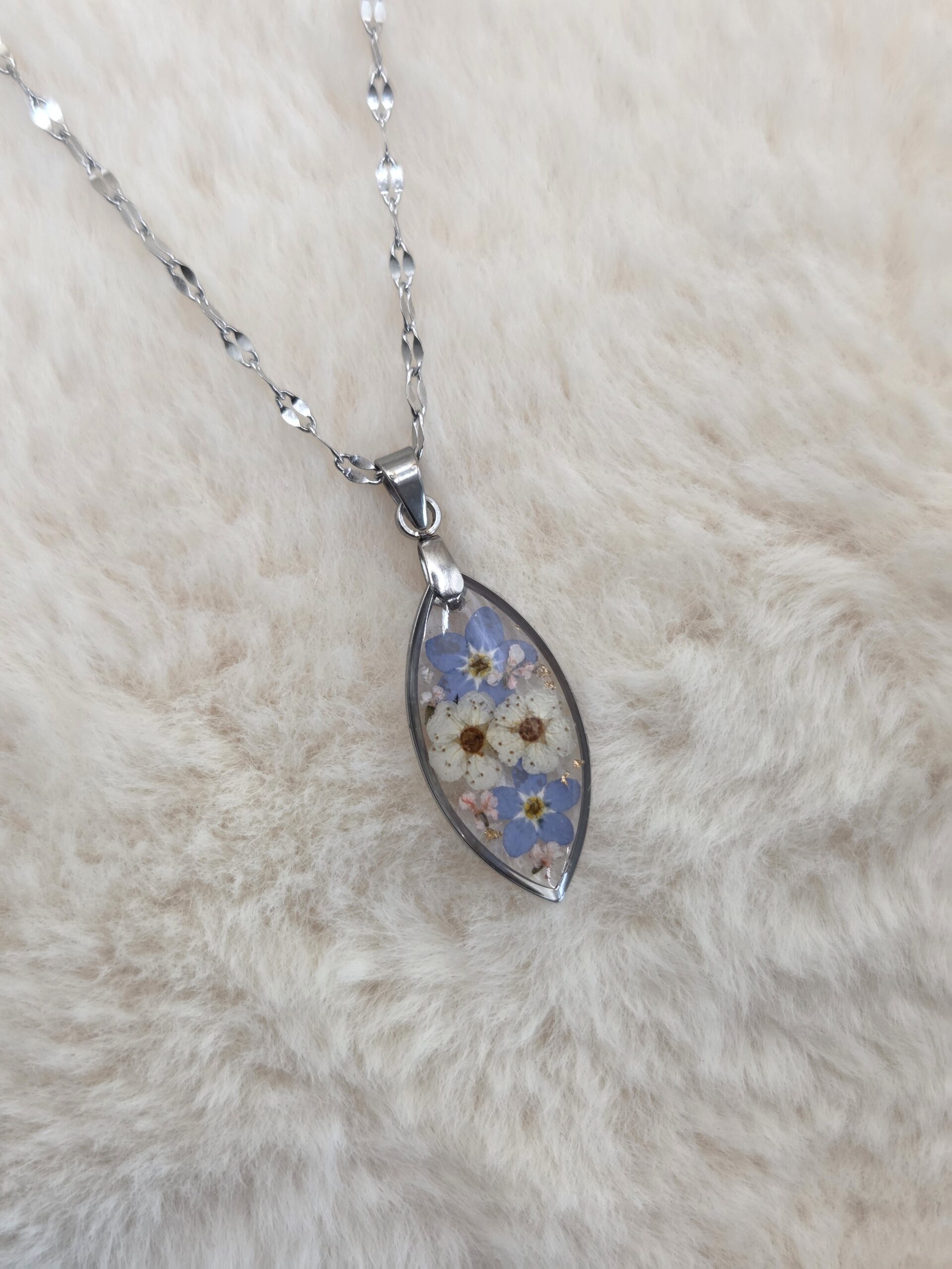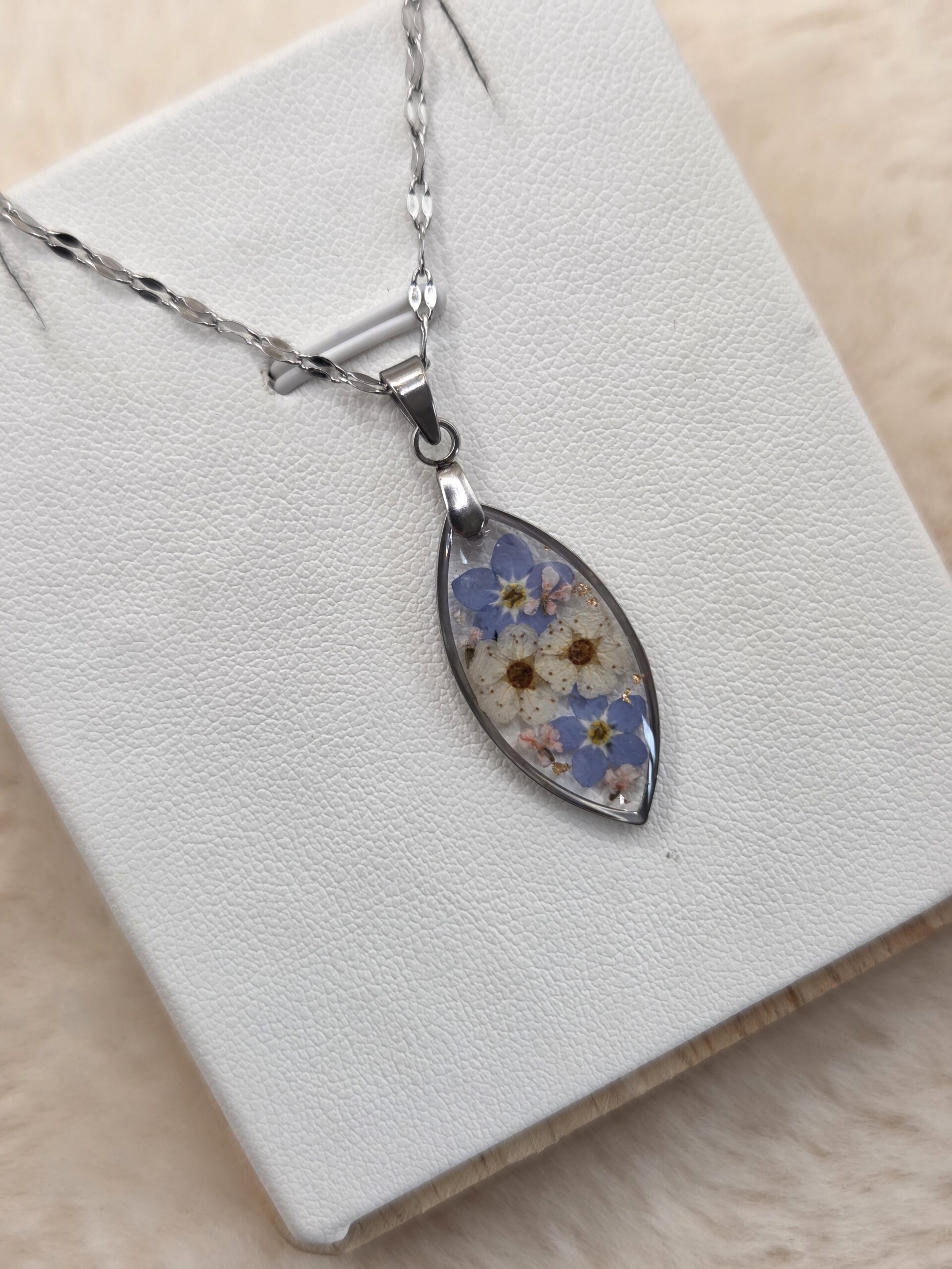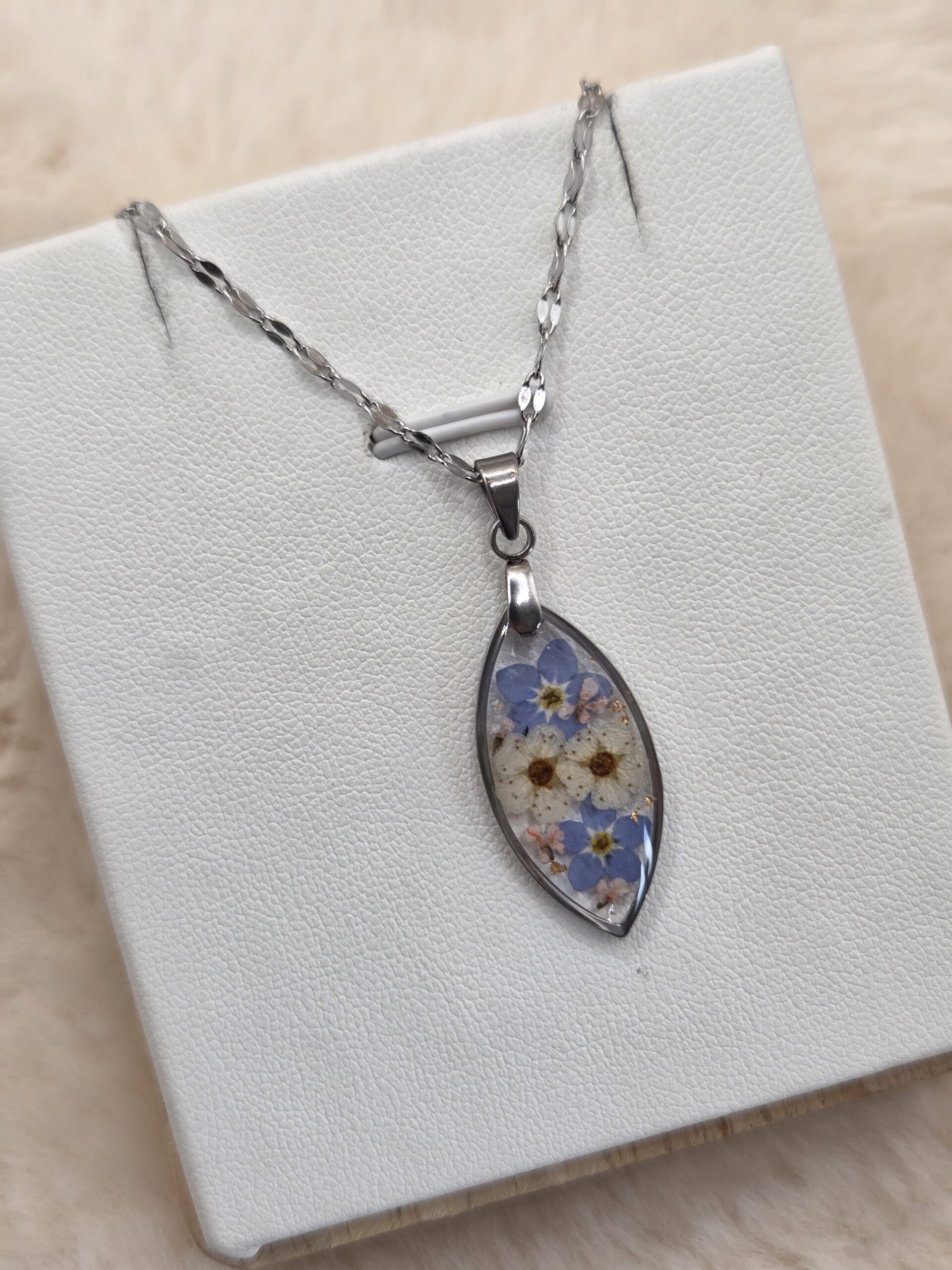 🌸 Pendentif navette en acier inoxydable – Fleurs séchées artisanales & éclats dorés ✨