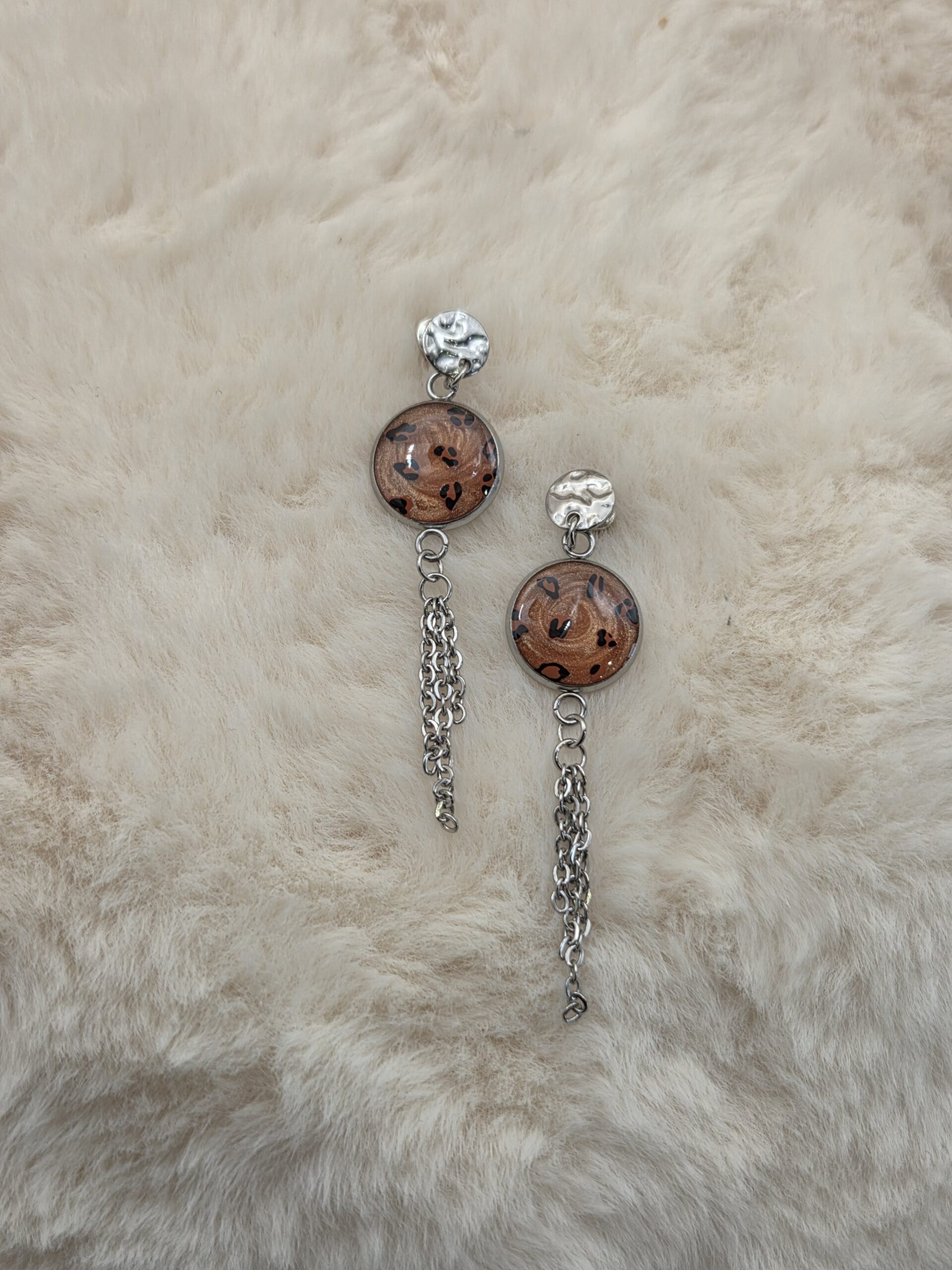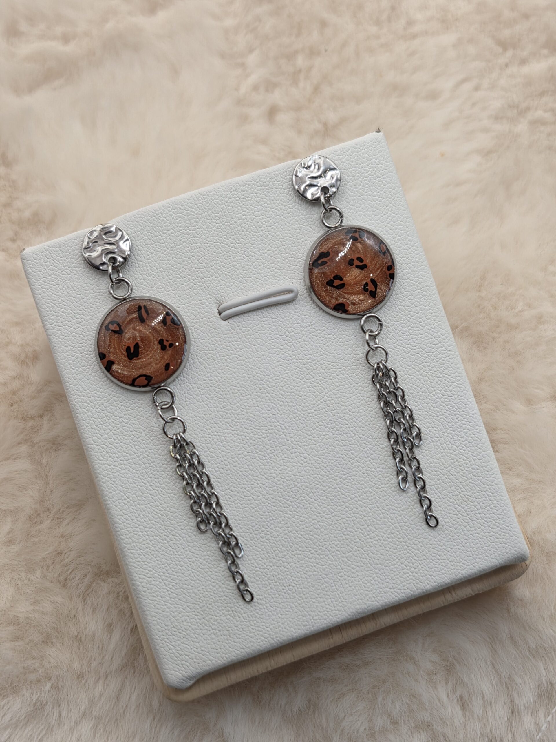 Chaque cabochon est surmonté de motifs léopard, ajoutant une note sauvage et tendance. Sous le cabochon, de délicates pampilles en chaînettes apportent du mouvement et une élégance supplémentaire à vos tenues 💃✨.