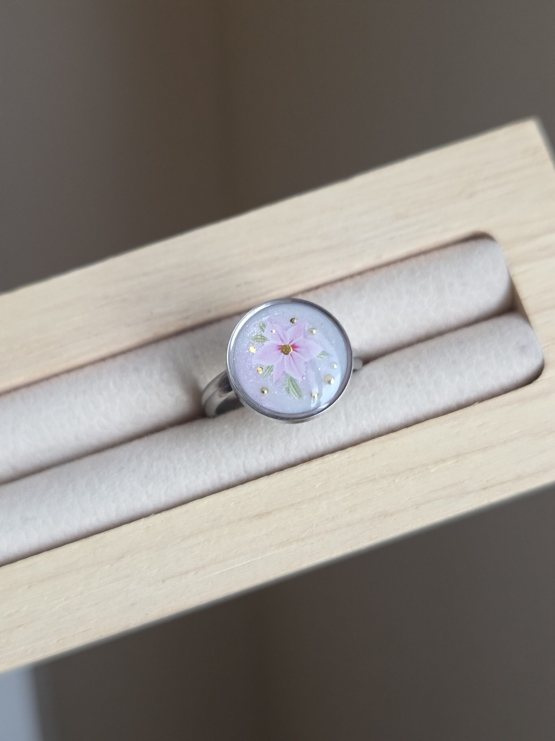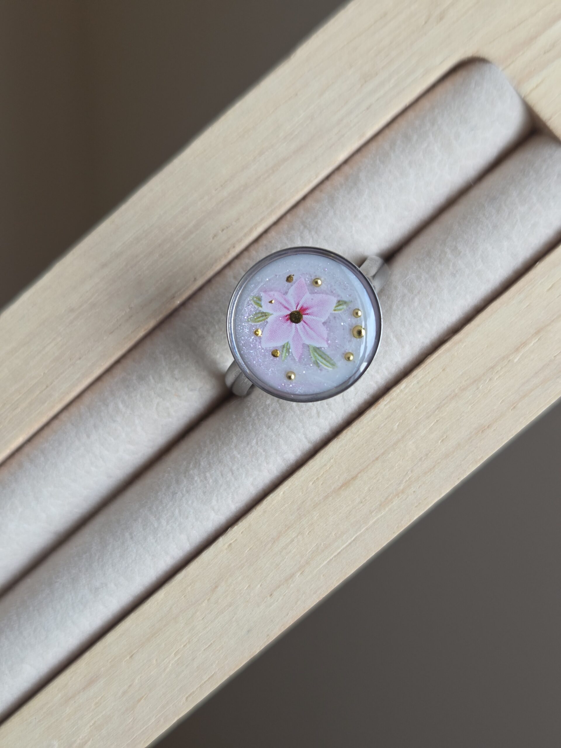 đ Bague rĂ©glable cabochon rond â NacrĂ© blanc & fleur rose âš