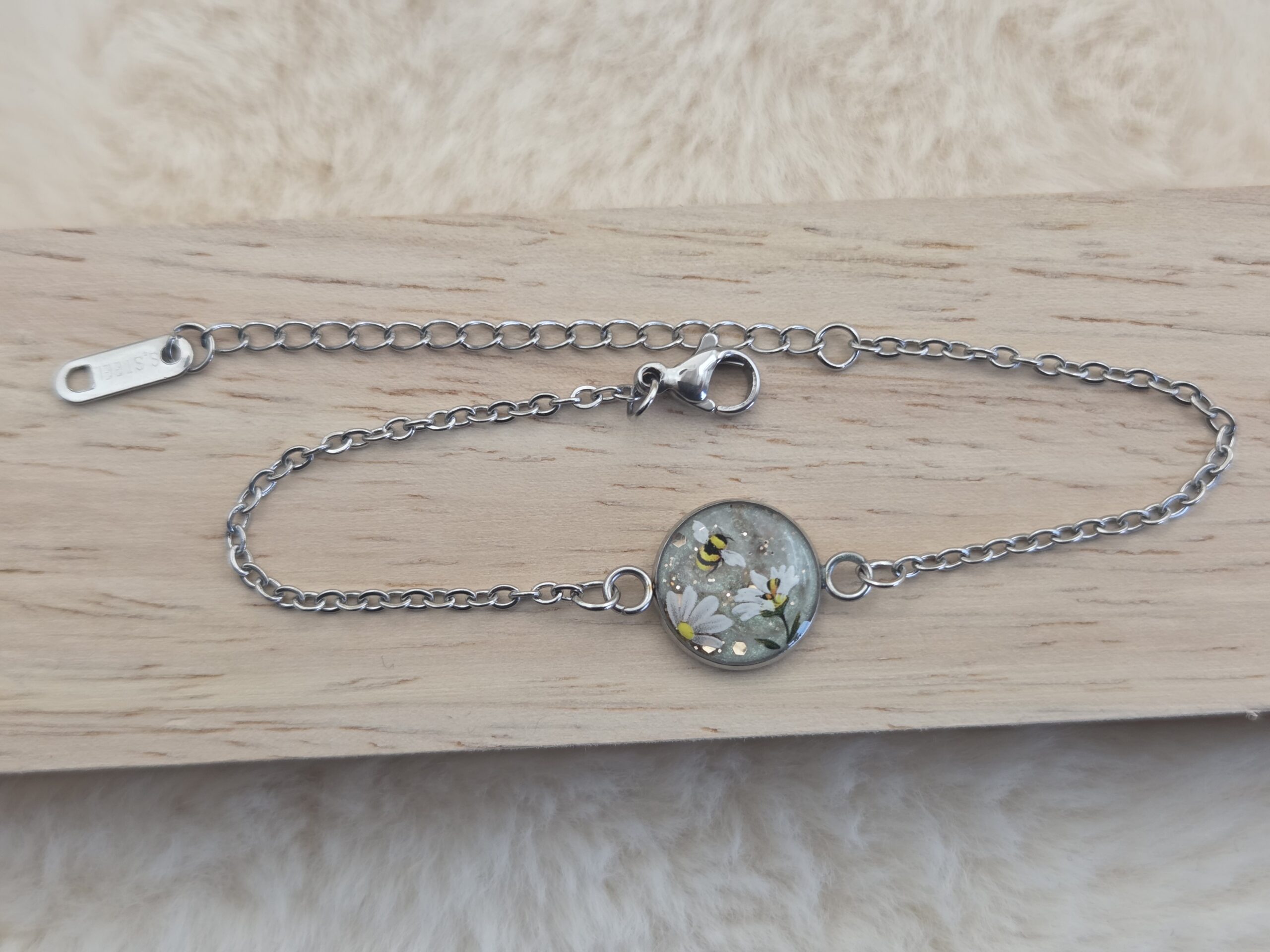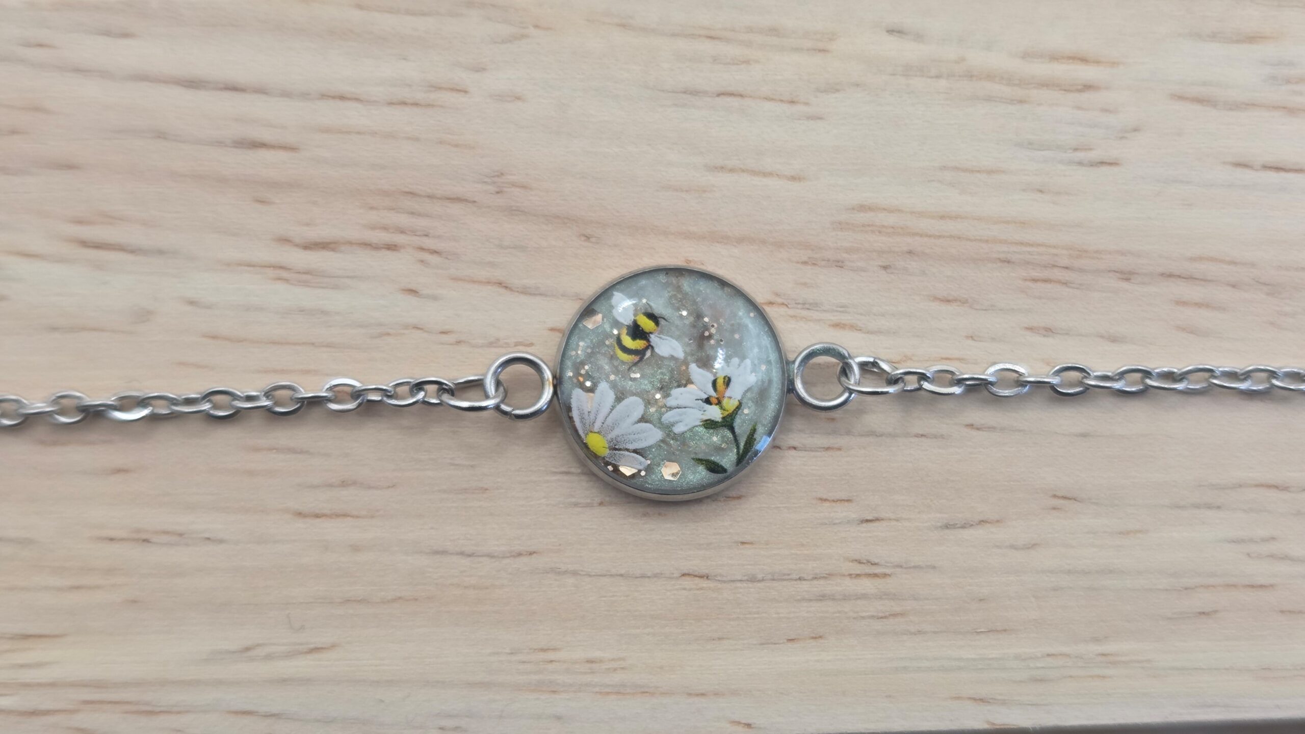 💚🐝 Bracelet chaîne en acier inoxydable – Cabochon floral vert nacré & abeille
