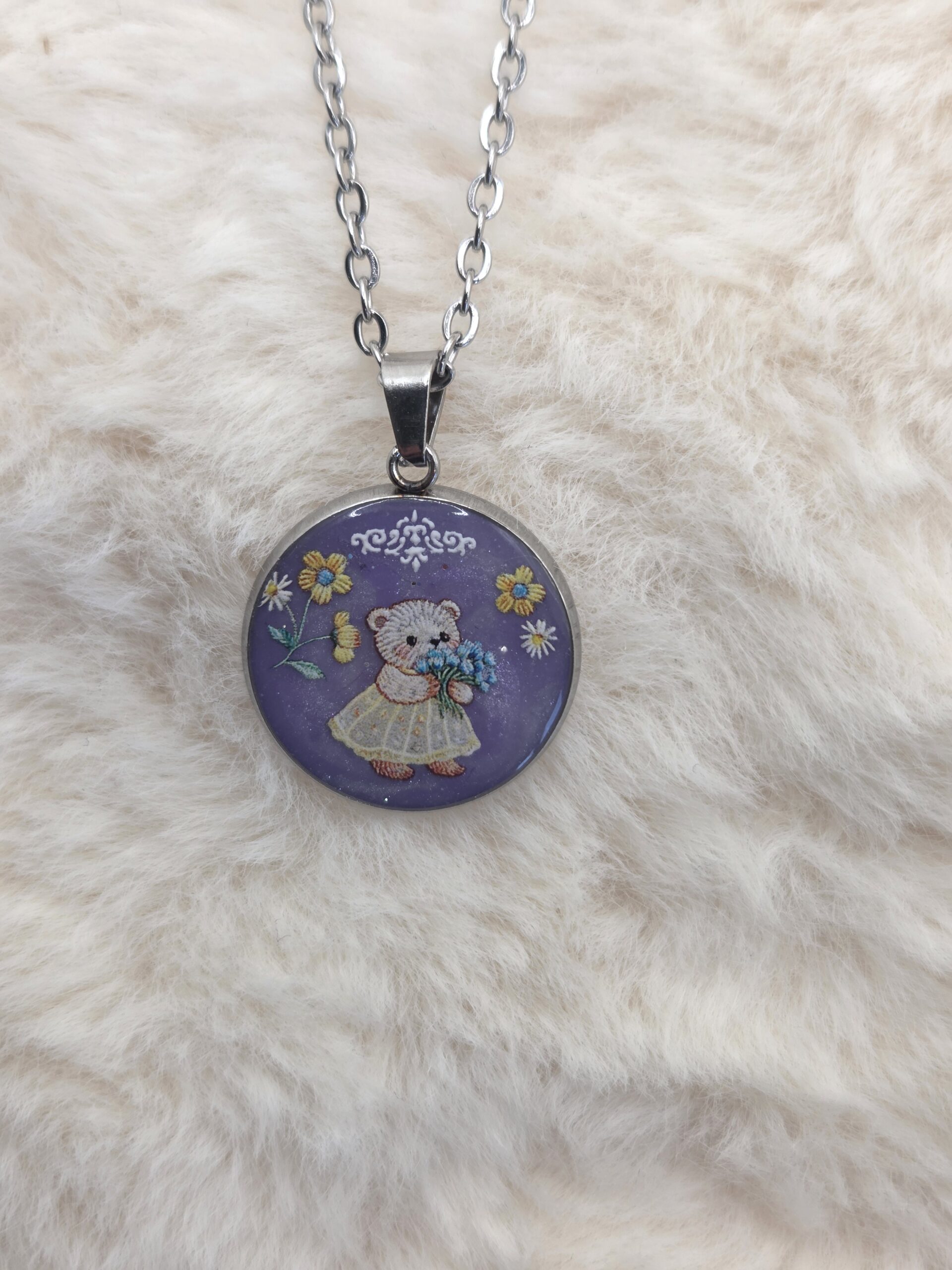 💜🧸 Pendentif Cabochon Rond – Ourson Fleuri & Fond Violet Irisé